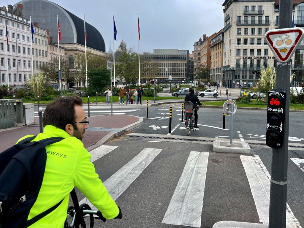 Like Paris, Lyon goes to great lengths to keep cyclists and pedestrians safe from cars. I know of no U.S. city that does this.