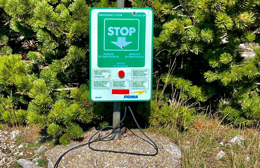 It’s an emergency stop button for the ski lift that passes overhead. In case anybody does anything stupid.