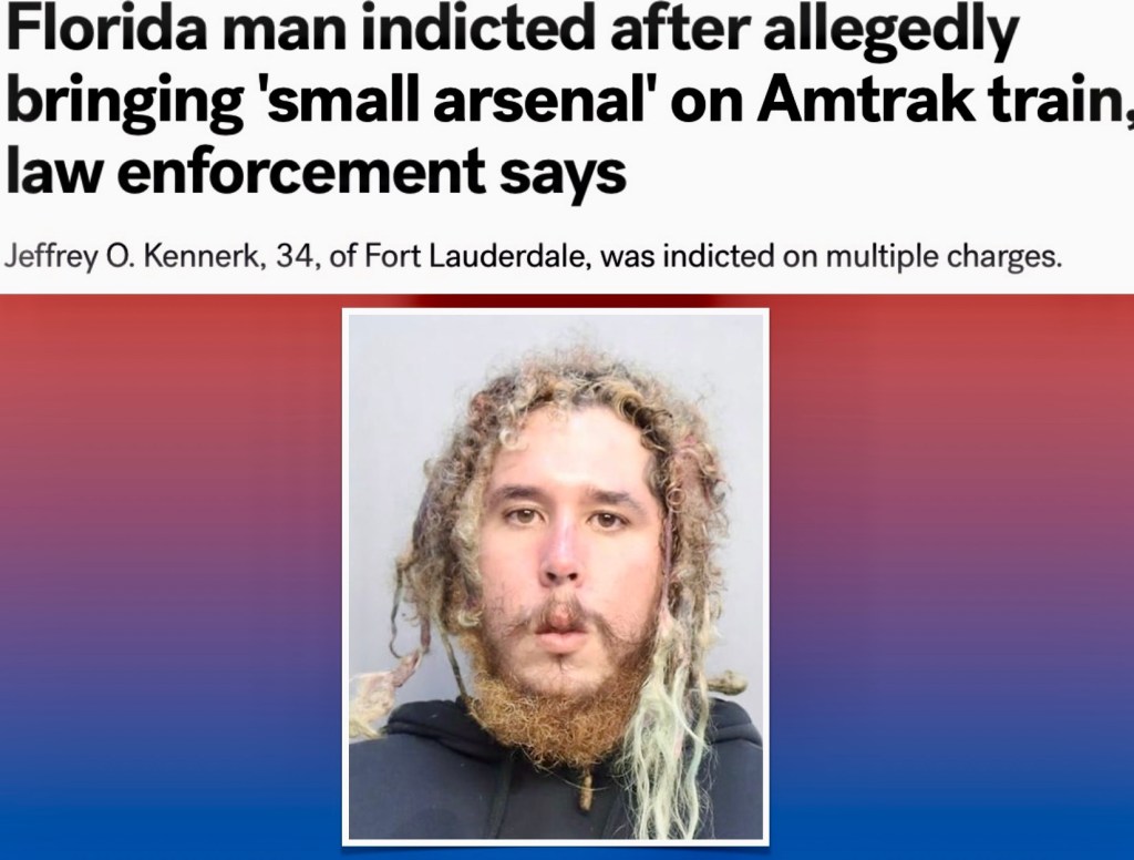 As per ABC news: “A Florida man allegedly boarded an Amtrak train in New Jersey carrying ammunition, multiple handguns and an AR-15 style rifle…Jeffrey O. Kennerk, 34, of Fort Lauderdale, was indicted on several charges, including aggravated assault, possession of a weapon for unlawful purpose and causing or risking widespread injury or damage…”