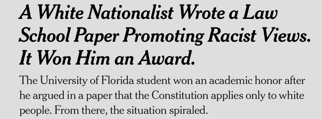 Still, the Times’ account of UF law student Preston Damsky winning a coveted award – on the nomination of a Trump-appointed judge and guest UF law professor – for his paper championing white power…only to be suspended for social media posts calling for the ‘abolition’ of Jews, speaks volumes about how low UF ethical standards have deteriorated under the iron thumb of The Great DeSanitizer.