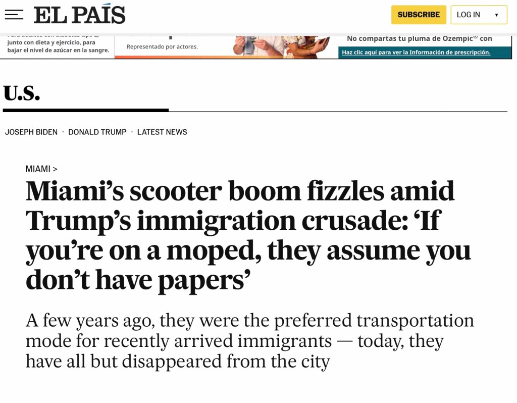 El Pais reports that Miami’s scooter “boom went up in smoke at the beginning of the year following the crackdown on immigrants led by Donald Trump…”