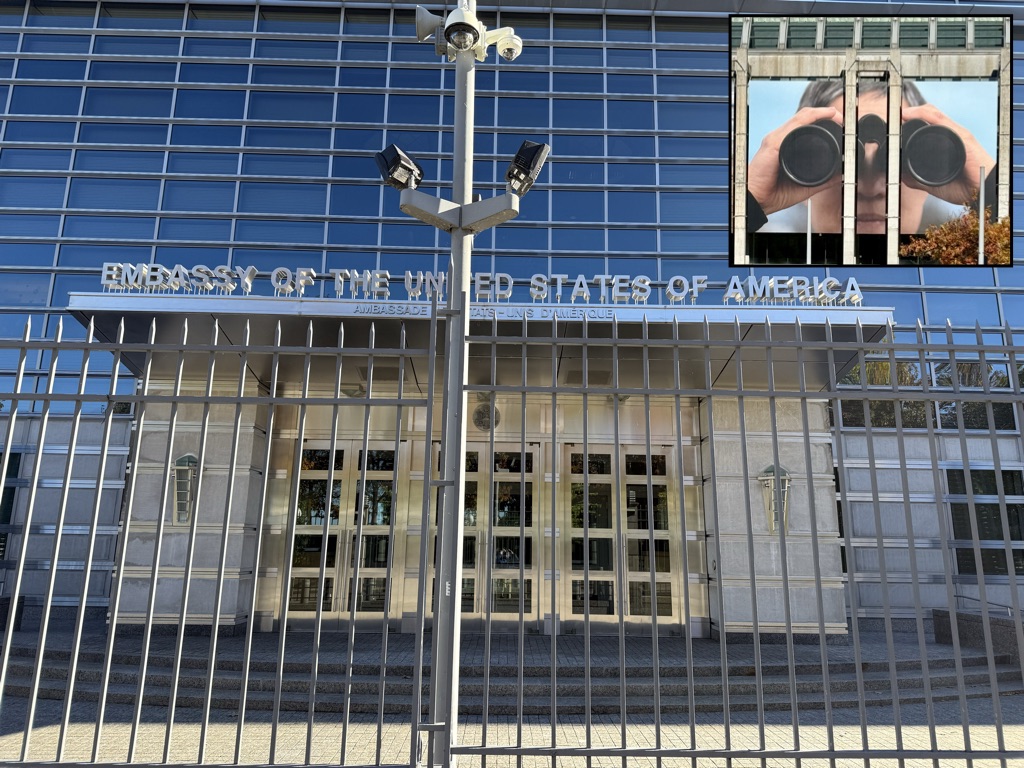 This is the U.S. Embassy, tucked in safely behind thick bollards and other protective barriers. Right next door is the National Gallery, where they appear to be running surveillance on the U.S. Embassy.
