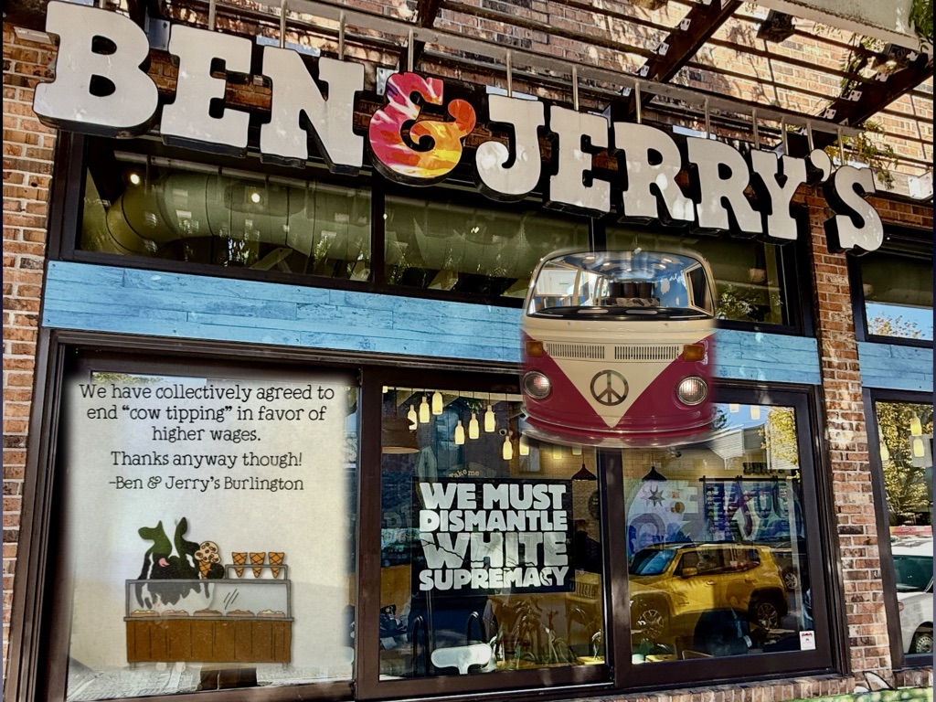 Fun fact. Ben & Jerry’s opened its first store in Burlington. And so finding a “We Must Dismantle White Supremacy” sign on the window of an ice cream shop is not at all surprising.