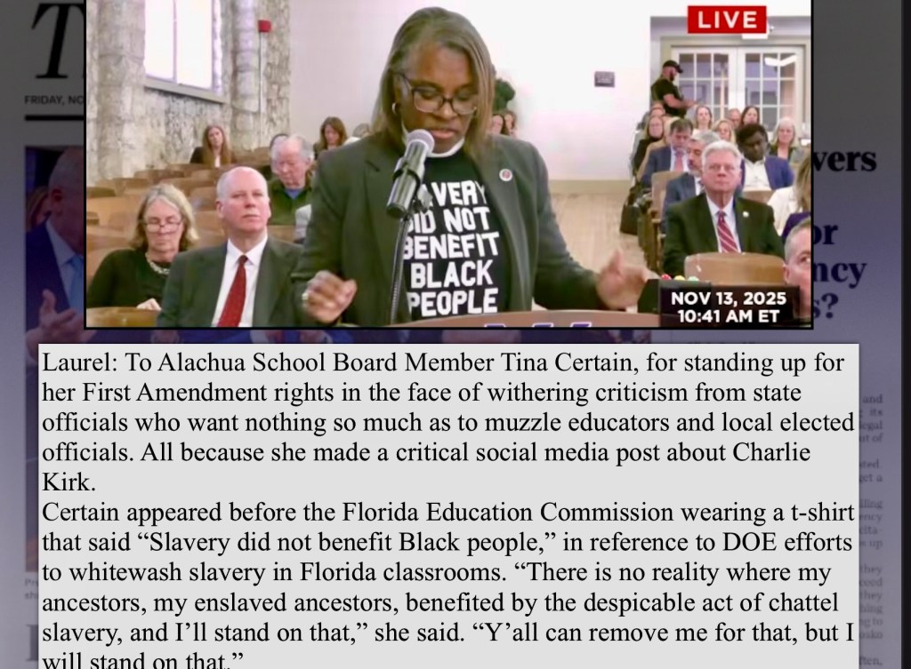 LAUREL: To U.S. Reps. Cliff Stearns, R-Ocala…for including in a new federal spending bill at least $3 million for various projects in Gainesville and Alachua County, including money for RTS, Santa Fe Community College, Teen Zone and Gainesville Regional Airport.