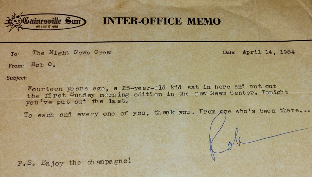 “Fourteen years ago, a 25-year-old kid sat in here and put out the first Sunday morning edition in the new News Center,” the memo read. “Tonight you’ve put out the last. To each and every one of you, thank you. From one who’s been there.”