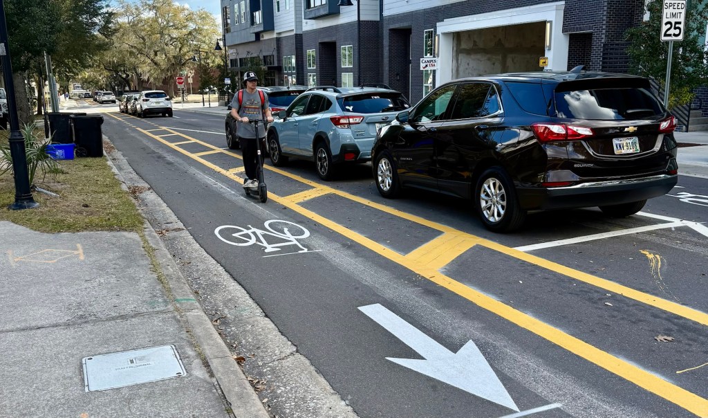 It is worth noting that GNV has recently added another one-way pair of streets adjacent to campus. Now, NW 12th and 13th streets, just east of UF, also feature single-lane, one-way car traffic as well as protected bike lanes.